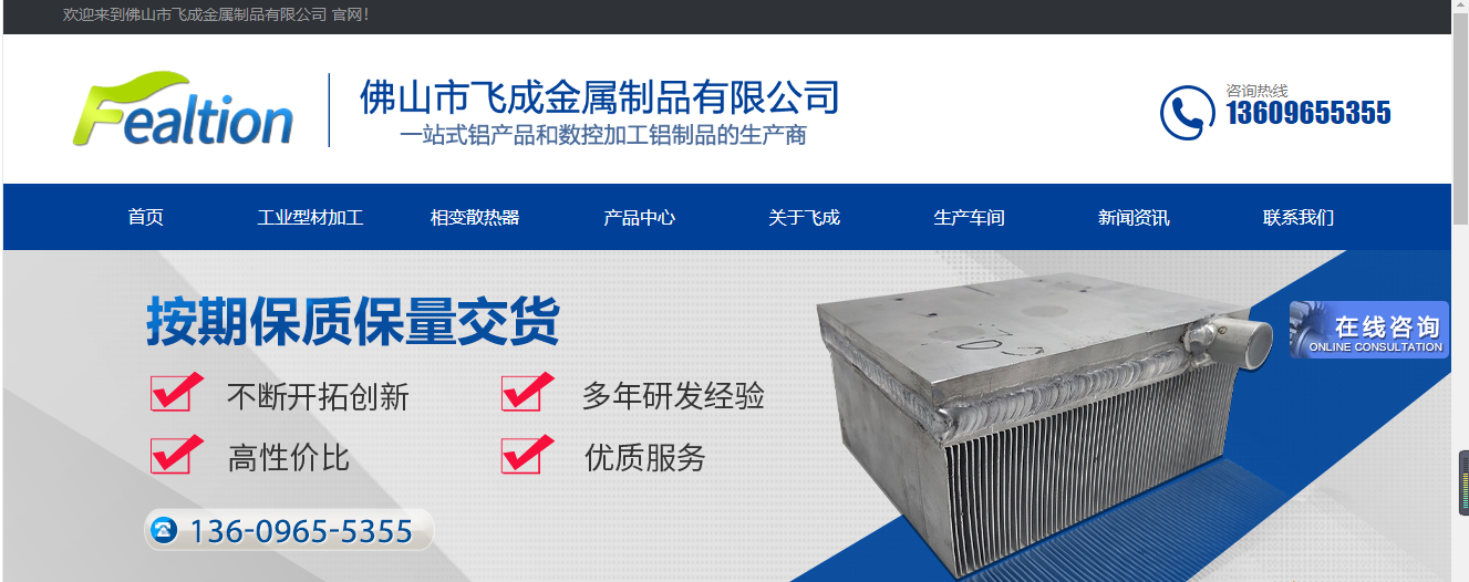 佛山市飛成金屬制品有限公司本公司由鋁型材生產和鋁材深加工、LED燈具套件、高鐵動車鋁材,新能源汽車鋁材、真空相變散熱片部分組成;是一家鋁材生產及深加工一體的廠家。自成立以未秉承“開拓創(chuàng)新、科學發(fā)展’為理念,我們擁有一支高素質的管理團隊,堅持以“ 客戶和品質第一”的原則, 通過ISO9001質量體系認證ISO14000環(huán)境體系認證JTS16949與EN15085體系認證,產品質量認證等。按期保質保量交貨,產品質量和服務得到客戶的一致好評。