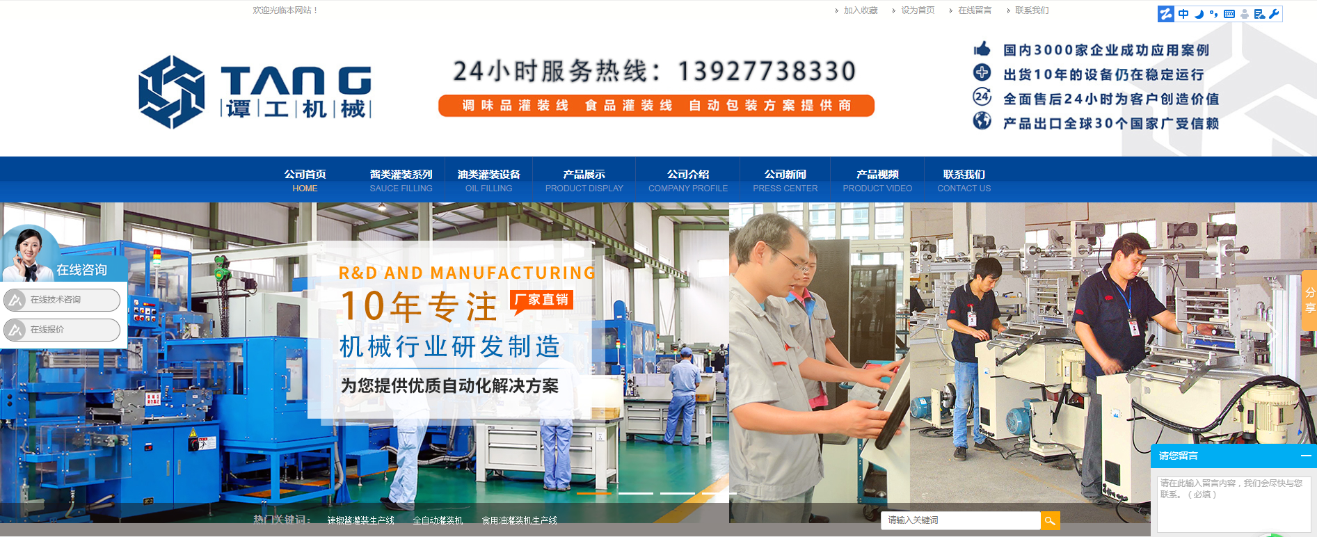 全自動(dòng)灌裝機(jī)網(wǎng)站建設(shè)案例分享: 佛山市譚工機(jī)械有限公司擁有中國(guó)專(zhuān)業(yè)自動(dòng)化灌裝設(shè)備制造資質(zhì)。主營(yíng)業(yè)務(wù)范圍:辣椒醬灌裝生產(chǎn)線(xiàn),花生油灌裝機(jī),全自動(dòng)灌裝機(jī),食用油灌裝生產(chǎn)線(xiàn),濃醬灌裝機(jī),老干媽辣椒醬灌裝機(jī),醬類(lèi)灌裝機(jī),潤(rùn)滑油灌裝機(jī),食用油灌裝機(jī),辣椒醬灌裝機(jī)。