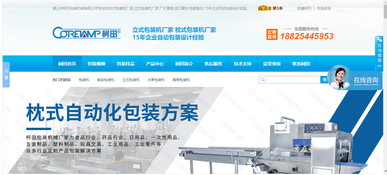 今天讓我們一起來分享一下包裝機網(wǎng)站推廣作品:佛山市柯田包裝機械有限公司總部位于廣東省佛山市新光源產(chǎn)業(yè)基地中心,成立于2012年,是一家集研發(fā)、設(shè)計、生產(chǎn)、銷售及售后服務(wù)于一體的高新制造企業(yè)。