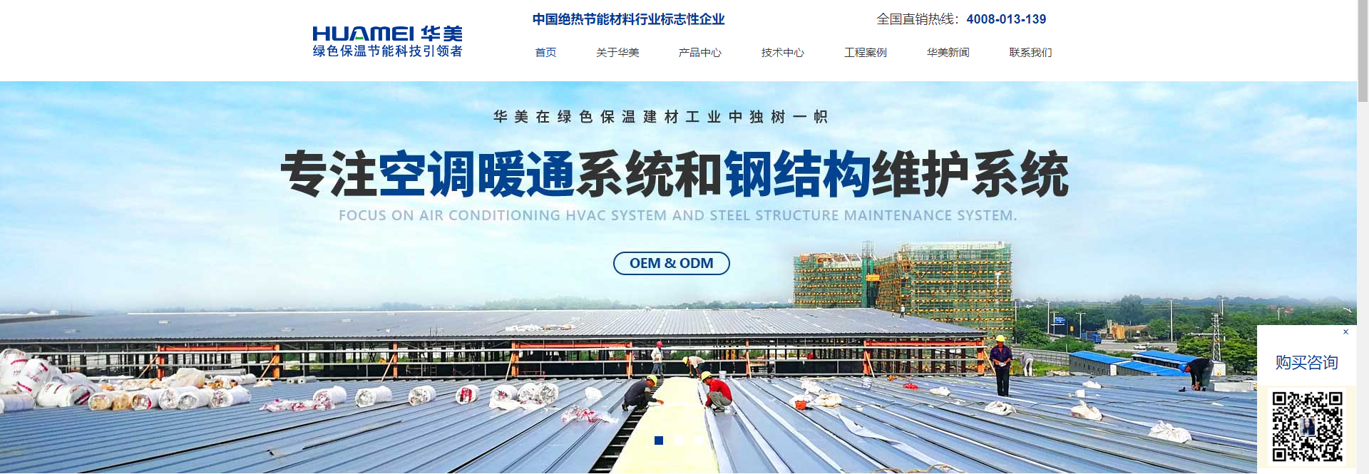 今天讓我們一起來分享一下玻璃棉制品網(wǎng)站建設(shè)案例:廣東華美玻璃棉制品銷售有限公司始創(chuàng)于2006年,公司隸屬森大企業(yè)集團旗下子公司,是華美節(jié)能科技集團有限公司華南區(qū)域 離心玻璃棉制品 橡塑絕熱制品 擠塑保溫制品的正規(guī)渠道代理商,是一家專業(yè)從事鋼結(jié)構(gòu)維護系統(tǒng)及空調(diào)暖通保溫系統(tǒng)的企業(yè),公司一直以環(huán)保創(chuàng)新為經(jīng)營理念。公司以立足大瀝、服務(wù)廣東為己任,經(jīng)過十余年壯大,倉儲式經(jīng)營占地面積達10000平方米。已與國內(nèi)多家鋼結(jié)構(gòu)安裝公司、空調(diào)安裝公司、幕墻安裝公司簽訂長期供貨協(xié)議,并成為多家中字頭企業(yè)戰(zhàn)略合作伙伴,2011年被譽為業(yè)內(nèi)最佳供應(yīng)商;2013年評為廣東省明星企業(yè),重合同守信用企業(yè);連續(xù)五年蟬聯(lián)華美玻璃棉制品單戶銷量前茅;2016年廣東華美玻璃棉制品銷售有限公司攜手華美節(jié)能科技集團繼續(xù)擴大產(chǎn)品銷售覆蓋范圍,成立廣西華美保溫材料制品銷售有限公司,2017年成立福建華美保溫材料制品銷售有限公司,與華美集團共建良好的保溫材料生態(tài)圈。