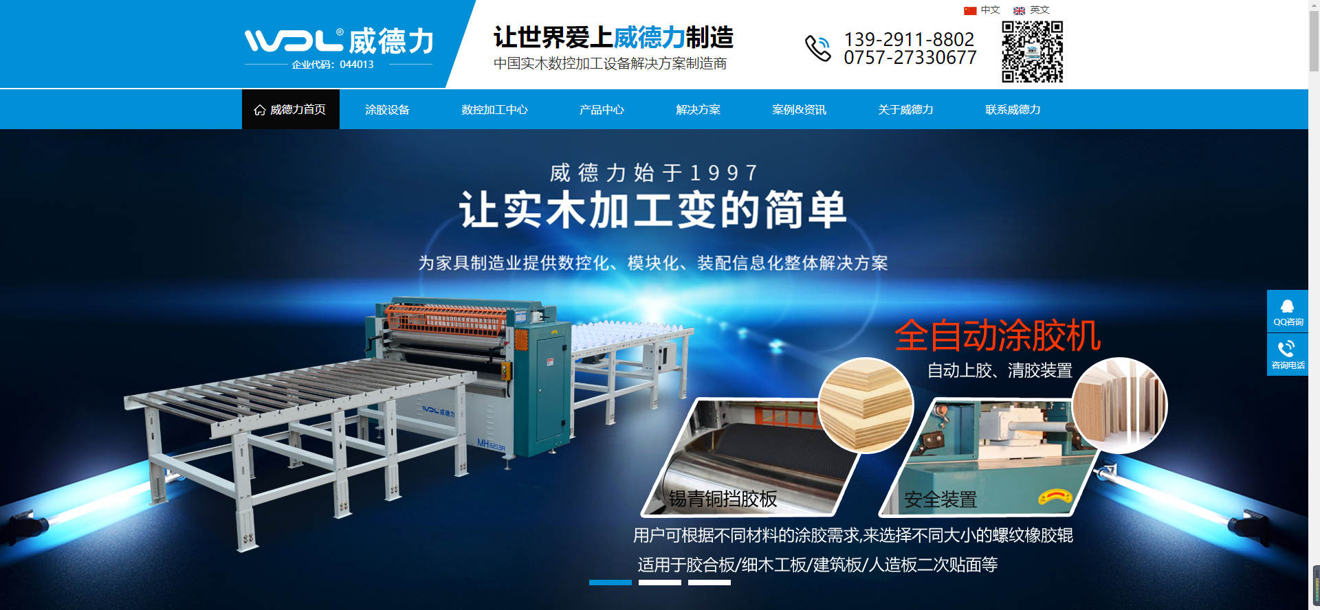 今天讓我們一起來分享一下木工壓機(jī)網(wǎng)站建設(shè)作品:廣東威德力機(jī)械實業(yè)股份有限公司位于中國木工機(jī)械重鎮(zhèn)——佛山市順德區(qū)倫教鎮(zhèn).我司經(jīng)過近 20 年的努力,目前已擁有十萬多平方米的現(xiàn)代化生產(chǎn)廠房,投入成熟的數(shù)控自動化加工設(shè)備和檢測設(shè)施,建立了一支數(shù)控系統(tǒng)應(yīng)用與機(jī)電一體化設(shè)計軟硬件開發(fā)相結(jié)合的高素質(zhì)團(tuán)隊,公司自主創(chuàng)新開發(fā)各類木材加工工藝的設(shè)備,包括:木工壓機(jī)(且我司是中國 3000 噸木工壓機(jī)較早與產(chǎn)銷規(guī)模較大的企業(yè))、數(shù)控鋸、數(shù)控銑機(jī)、數(shù)控榫槽機(jī)、數(shù)控加工中心、數(shù)控打角鉆孔攻牙機(jī)、木工銑床、木工鋸床、集成材加工設(shè)備、木工機(jī)械輔助設(shè)備、環(huán)保設(shè)備的除塵設(shè)備和噴漆保護(hù)設(shè)備,涵蓋了木材加工業(yè)鋸切、刨切、集成材銑削、拼接、拼板、砂光及家具制造業(yè)中銑、鋸、鉆加工,成型、貼面、砂光、裝配、噴漆等工序所需的機(jī)械裝備。威德力全國200多家銷售服務(wù)中心覆蓋了各省份的一、二級城市,輻射華北、華中、華南、西南等區(qū)域;在海外市場的銷售與推廣上,公司產(chǎn)品已遠(yuǎn)銷至國外 80 多個國家。近20年來兢兢業(yè)業(yè)地發(fā)展。2013年被廣東省認(rèn)定為廣東省制造企業(yè) 500 強(qiáng)。