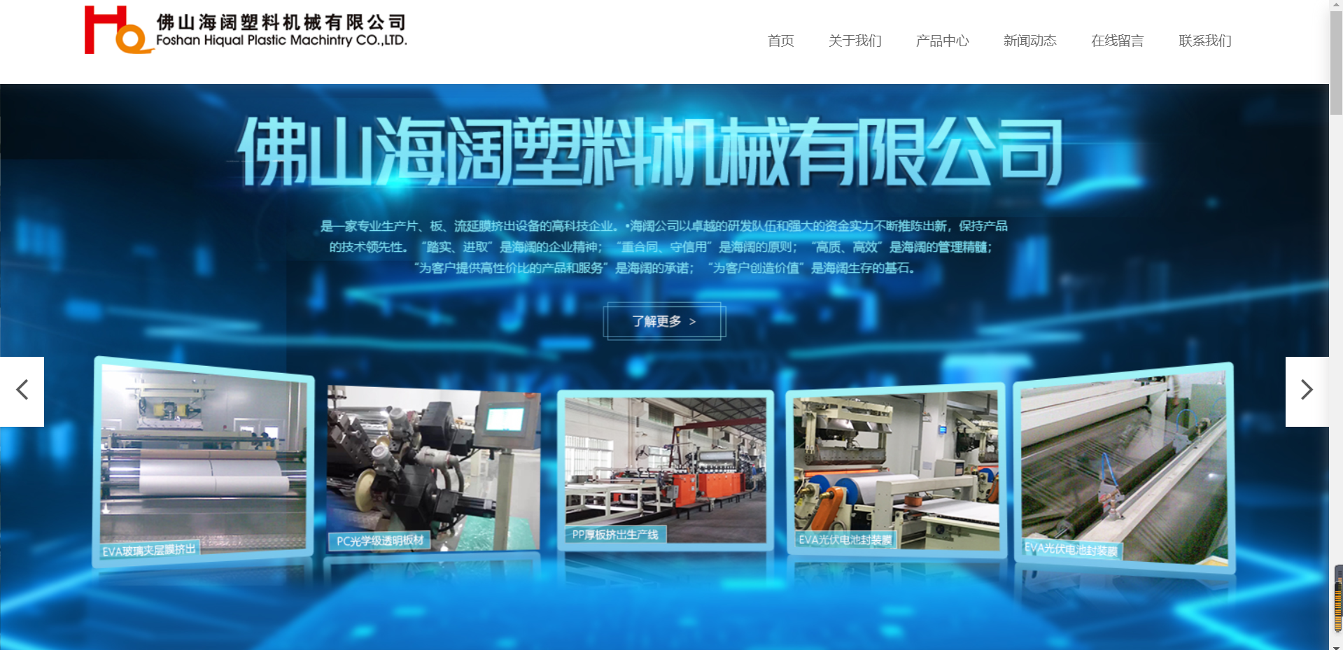 今天讓我們一起來(lái)分享一下擠出設(shè)備網(wǎng)站推廣作品:佛山海闊塑料機(jī)械有限公司是一家專業(yè)生產(chǎn)片、板、流延膜擠出設(shè)備的高科技企業(yè)。公司位于中國(guó)美麗富饒的珠江三角洲腹地-廣東省佛山市,毗鄰廣佛高速公路謝邊出口,距佛山市中心約十分鐘車(chē)程,到廣州市區(qū)也只要30分鐘,交通十分便利。