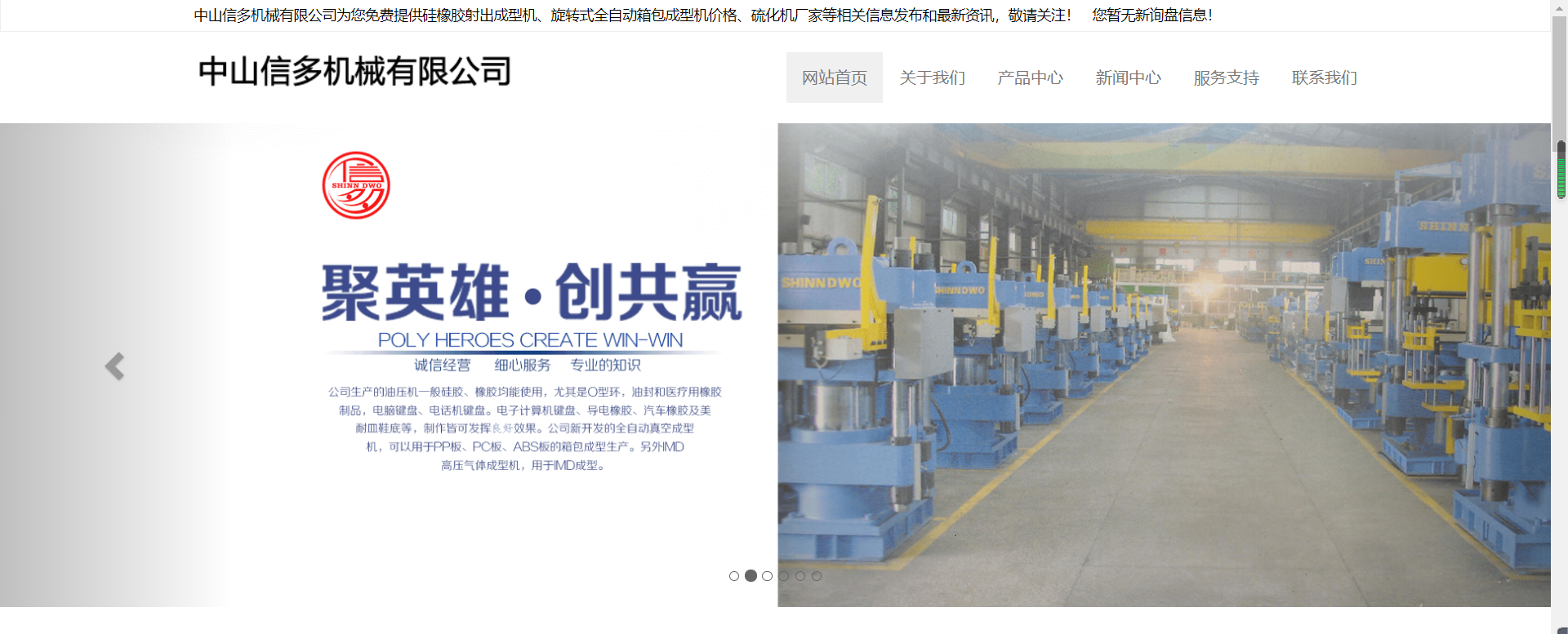 今天讓我們一起來分享一下油壓成型機(jī)網(wǎng)站設(shè)計(jì)案例:信多企業(yè)有限公司成立于1980年,經(jīng)歷30多年的實(shí)踐與開發(fā),早已成為專業(yè)制造油壓的廠商之一。董事長陳聰奇先生早年是以自動控制起家,且于1970年即以《雄兵電機(jī)有限公司》享譽(yù)于臺灣的自動控制業(yè)界。根據(jù)市場的發(fā)展,公司于1995年在馬來西亞建立分公司。相繼于1997年再到廣東建立分廠,以便滿足客戶的不斷需求。