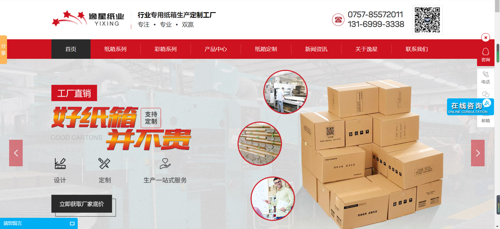 今天讓我們一起來分享一下紙箱網(wǎng)站設計作品:佛山市南海逸星紙類制品有限公司,是佛山紙箱廠紙箱包裝十大品牌,專業(yè)制作各種規(guī)格紙箱、紙盒、飛機盒、彩箱、彩盒、網(wǎng)購紙盒、水果箱、汽配紙箱、周轉箱、坑盒、扣底盒、折盒、飛機盒、進口美牛紙箱、快遞箱紙箱等進出口紙箱包裝制作。
