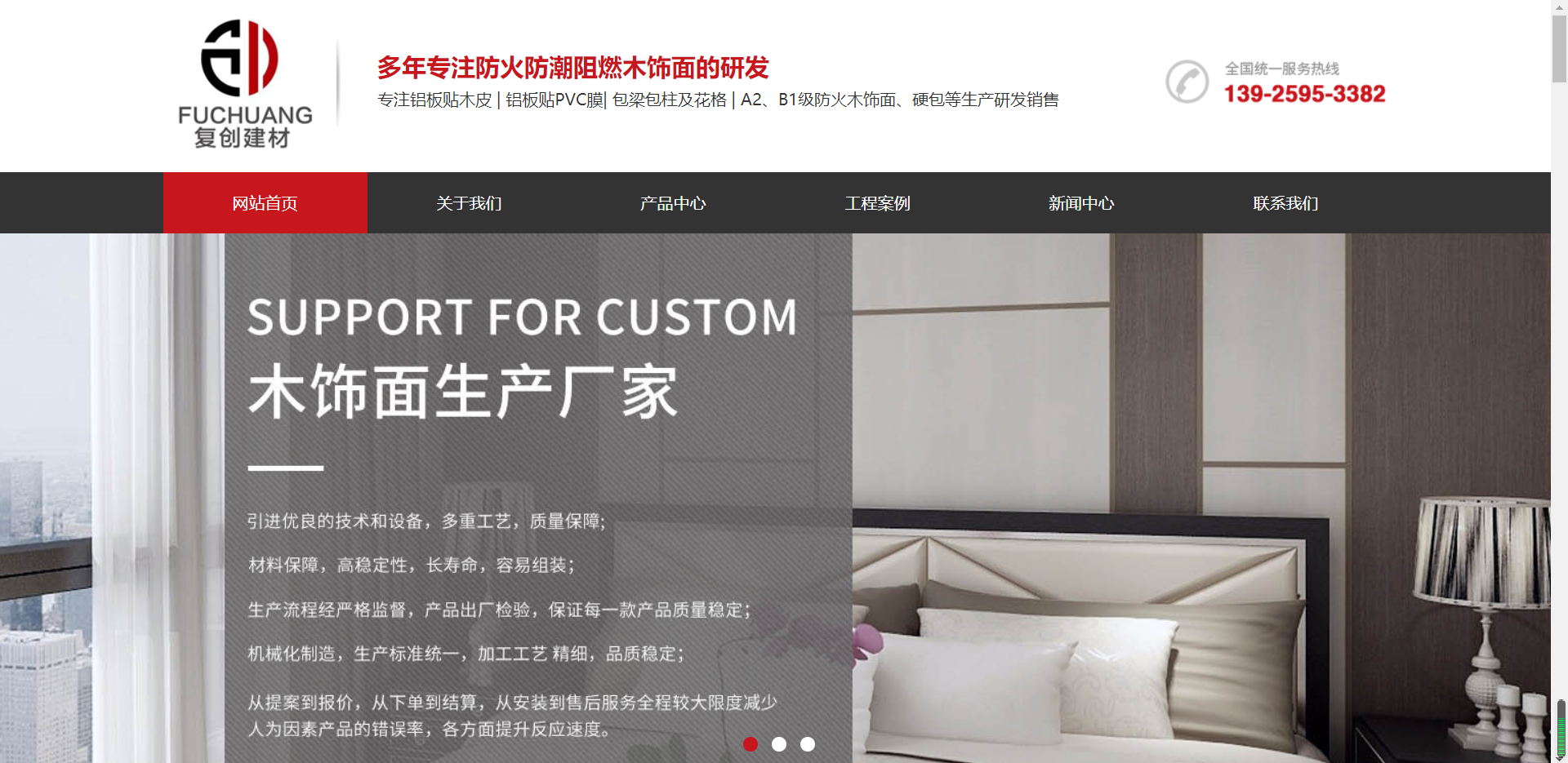 今天讓我們一起來分享一下木飾面網(wǎng)站推廣作品:佛山市復(fù)創(chuàng)建材有限公司(簡(jiǎn)稱復(fù)創(chuàng)建材)是一家集研發(fā),設(shè)計(jì),生產(chǎn)銷售單鋁板貼天然木皮,防火板,皮革布藝等飾面材料系列,鋁板飾面復(fù)合阻燃板材,鋁蜂窩飾面板及酒店別墅,船用家具的生產(chǎn)企業(yè)。復(fù)創(chuàng)建材堅(jiān)守以人為本,以誠為先,以創(chuàng)造價(jià)值為榮的核心理念,構(gòu)建優(yōu)秀管理平臺(tái),以技術(shù)創(chuàng)新,綠色環(huán)保,品質(zhì)優(yōu)秀,成本優(yōu)越的產(chǎn)品,以精,準(zhǔn),快的服務(wù)形成復(fù)創(chuàng)強(qiáng)大的核心競(jìng)爭(zhēng)力,為復(fù)創(chuàng)的快速發(fā)展奠定堅(jiān)實(shí)基礎(chǔ)。