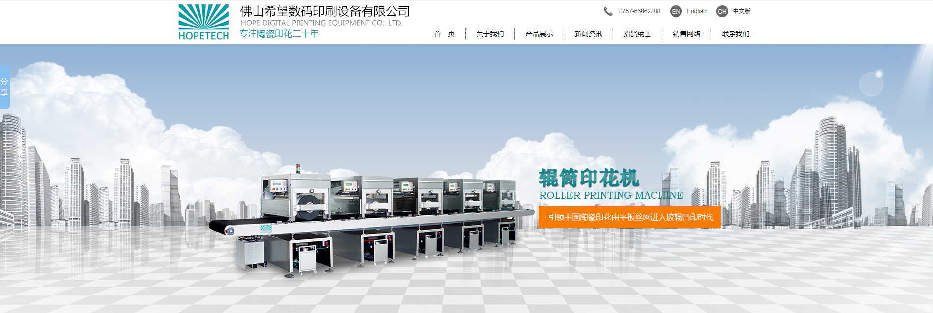 今日分享印刷設(shè)備: 佛山希望數(shù)碼印刷設(shè)備有限公司是一家集研發(fā)、生產(chǎn)、銷售與服務(wù)為一體的高新技術(shù)企業(yè)。自1996年進(jìn)入陶瓷行業(yè),希望公司從電子產(chǎn)品軟硬件的研發(fā)起步,經(jīng)過十幾年的不懈努力及發(fā)展,現(xiàn)已成為國內(nèi)科技含量高、門類齊全、規(guī)格全面的印花和施釉設(shè)備專業(yè)制造企業(yè)。從國產(chǎn)第一臺皮帶式平板印花機(jī),精確套版印花機(jī)到中國首家研發(fā)的硅膠輥筒印花機(jī),再到第一臺顛覆傳統(tǒng)陶瓷印刷格局的國產(chǎn)數(shù)碼噴墨機(jī),希望公司以值得信賴的品質(zhì)和真誠的服務(wù),成功奠定了其在行業(yè)內(nèi)的領(lǐng)軍地位。