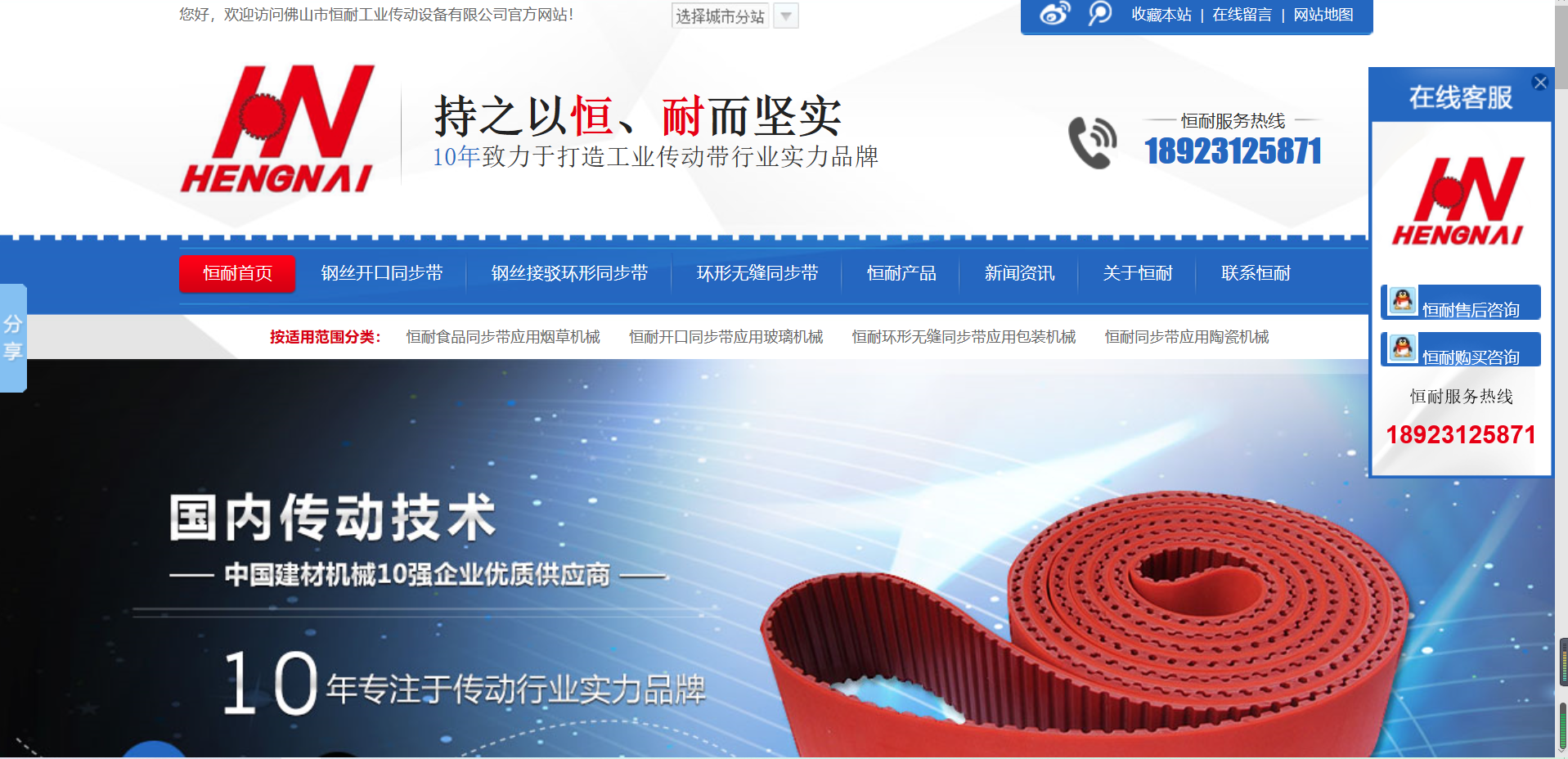 今天讓我們一起來分享一下同步帶網(wǎng)站推廣作品:佛山市恒耐工業(yè)傳動設(shè)備有限公司坐落在美麗的陽江市陽春春城,交通方便,離高速公路陽春南出口不到1公里。占地面積30000幾平方米,公司全線引進(jìn)意大利、德國等先進(jìn)生產(chǎn)設(shè)備和生產(chǎn)工藝。年產(chǎn)量超過100000條聚氨酯環(huán)形無駁口同步帶,品質(zhì)卓越,具有抗磨損,抗張拉,耐高溫,精度高等優(yōu)勢,成為“科達(dá)潔能”、“一鼎科技”等優(yōu)秀供應(yīng)商,公司產(chǎn)品適用于陶瓷、玻璃、紡織、噴繪、鋁型材、自動化設(shè)備等機(jī)械所涉及到的同步帶。公司單品遠(yuǎn)銷意大利、土耳其、埃及、印度、伊朗、巴西及東南亞地區(qū),廣泛得到國內(nèi)外客戶青睞。