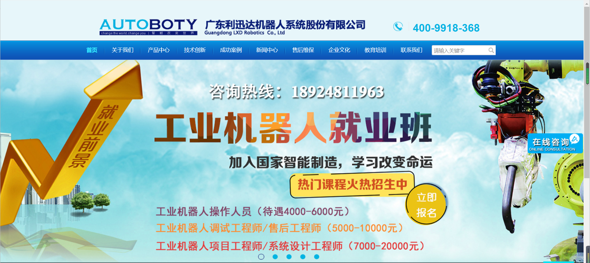 今天讓我們一起來(lái)分享一下工業(yè)機(jī)器人網(wǎng)站推廣作品: 廣東利迅達(dá)機(jī)器人系統(tǒng)股份有限公司,是中國(guó)現(xiàn)時(shí)技術(shù)先進(jìn)、實(shí)力強(qiáng)大的機(jī)器人系統(tǒng)集成商。自2008年籌建至今,公司共建立七大事業(yè)部和一個(gè)智能工匠加工中心,業(yè)務(wù)范圍涵蓋拋光打磨、焊接、搬運(yùn)、裝配以及機(jī)器人教育、服務(wù)等。