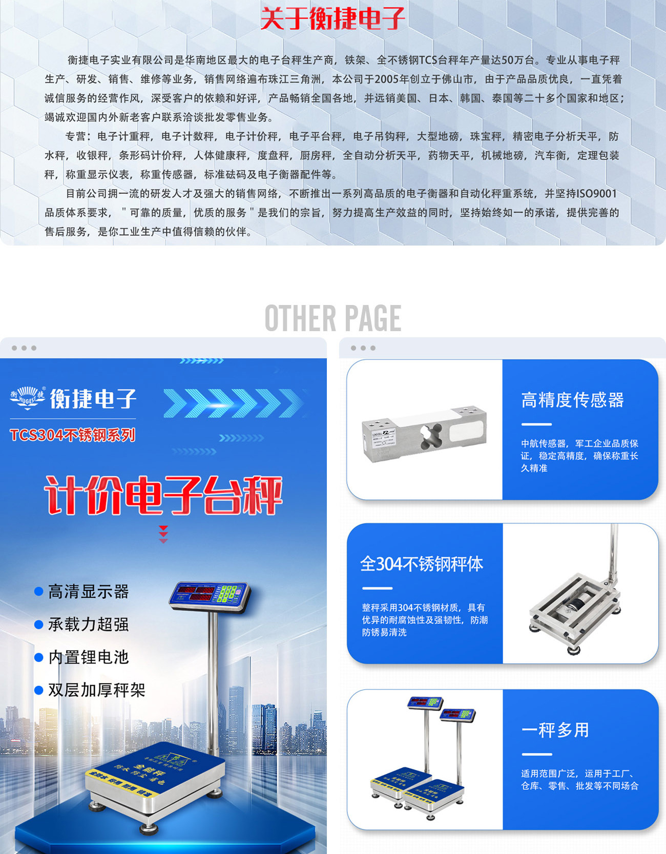 衡捷電子實業(yè)有限公司是華南地區(qū)較大的電子臺秤生產(chǎn)商,鐵架、全不銹鋼TCS臺秤年產(chǎn)量達50萬臺。專業(yè)從事電子秤生產(chǎn)、研發(fā)、銷售、維修等業(yè)務(wù),銷售網(wǎng)絡(luò)遍布珠江三角洲,本公司于2005年創(chuàng)立于佛山市,由于產(chǎn)品品質(zhì)優(yōu)良,一直憑著誠信服務(wù)的經(jīng)營作風,深受客戶的依賴和好評,產(chǎn)品暢銷全國各地,并遠銷美國、日本、韓國、泰國等二十多個國家和地區(qū)。