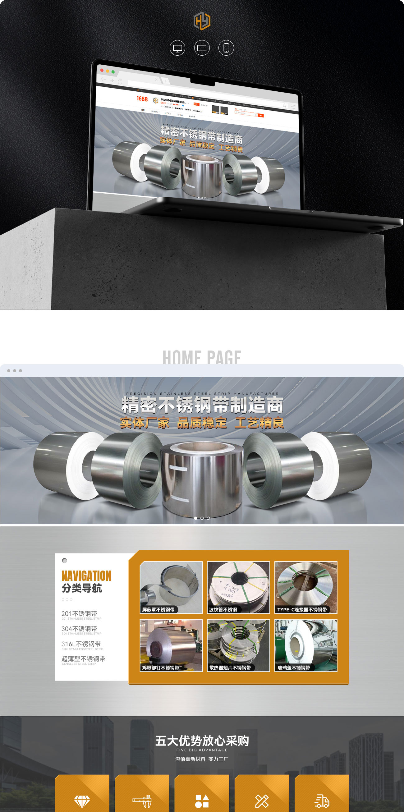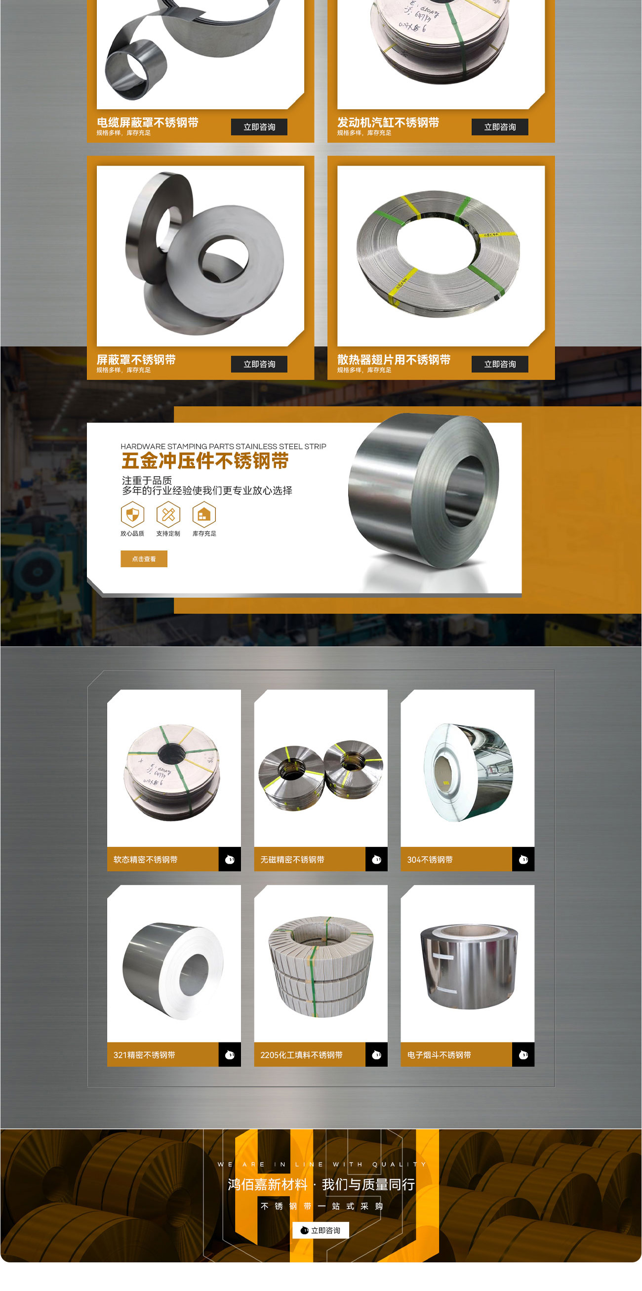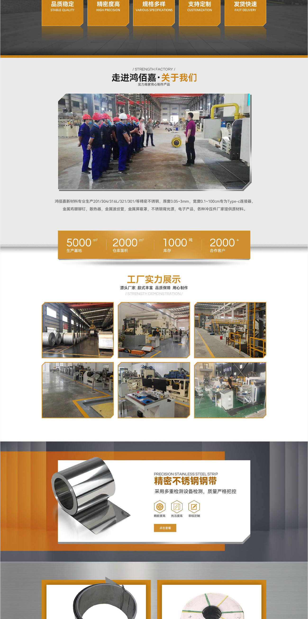 鴻佰嘉新材料專(zhuān)業(yè)生產(chǎn)201/304/316L/321/301/等精密不銹鋼,厚度0.05~3mm,寬度0.1~100cm專(zhuān)為T(mén)ype-c連接器,金屬雞眼鉚釘,散熱器,金屬波紋管,金屬屏蔽罩,不銹鋼背光源,電子產(chǎn)品,各種沖壓件廠家提供原材料。