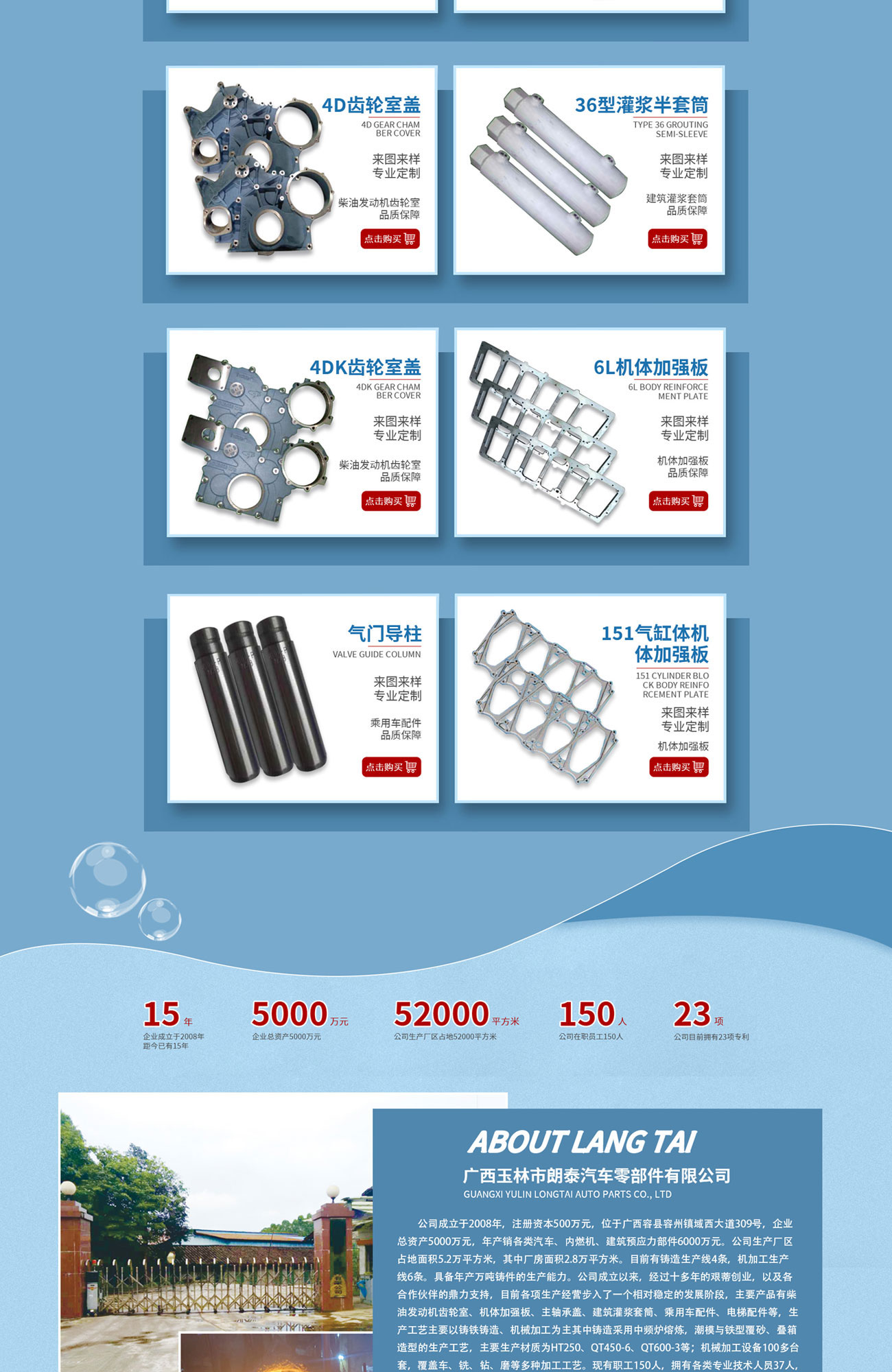 公司成立于2008年,注冊(cè)資本500萬(wàn)元,位于廣西容縣容州鎮(zhèn)域西大道309號(hào),企業(yè)總資產(chǎn)5000萬(wàn)元,年產(chǎn)銷各類汽車、內(nèi)燃機(jī)、建筑預(yù)應(yīng)力部件6000萬(wàn)元。公司生產(chǎn)廠區(qū)古地面積5.2萬(wàn)平方米,其中廠房面積2.8萬(wàn)平方米。目前有鑄造生產(chǎn)線4條,機(jī)加工生產(chǎn)線6條。具備年產(chǎn)萬(wàn)噸鑄件的生產(chǎn)能力。